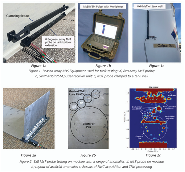 Magnetostrictive sensor (MsS) technology utilizes magnetostrictive properties of ferromagnetic ribbons to generate ultrasonic vibrations. In the past, SwRI used single element probes with apertures up to 100 mm (4 in.) for data collection around tank bottoms. The probe was manually moved around the tank; time-amplitude waveform data was plotted into an ultrasonic image of the tank floor. The next step in technology evolution utilizes a probe with an array of sensors and new data post-processing algorithms. Figure 1a shows a SwRI 8x8© probe with 8 magnetostrictive sensor segments. Each segment of the array is 76 mm (3 in.) wide and consists of two independent magnetostrictive elements that are used for direction control. The probe has flexible joints between segments and can bend around a large radius. Each segment is individually connected to an SwRI MsSRV5M guided wave instrument with integrated multiplexer, shown in Figure 1b. This pulser-receiver instrument facilitates pitch-catch and pulse-echo data collection methods from every possible combination of transmit/ receive sensor segments. The probe can be installed on the tank bottom extension or tank walls using a magnetic clamping fixture (shown in Figure 1a and 1c).