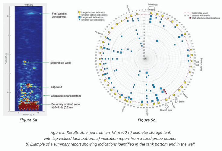 Figure 5b shows a typical indication report with indications originating from the tank bottom marked with yellow squares and indications originating from the tank wall marked with blue squares. Indication ranking information based on relative amplitude was also prepared.