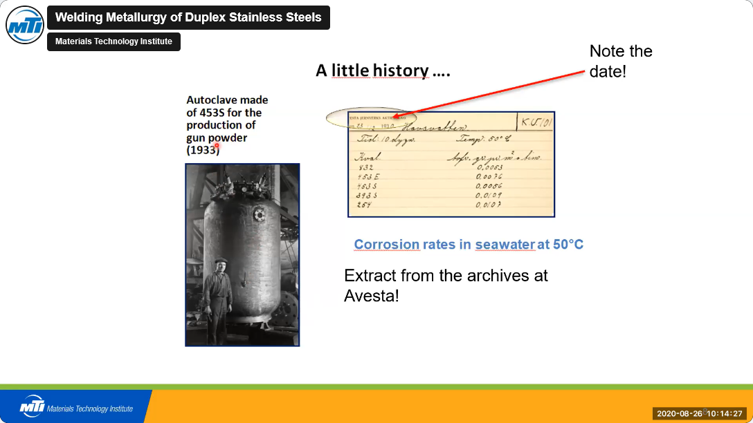 The historical evolution of different generations of duplex stainless steels will be traced and it will be shown how welding metallurgy has played a central role in these developments.